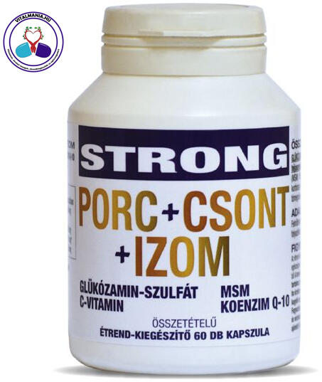 A Strong Porc Csont Izom kapszulában lévő C-vitamin hozzájárul a megfelelő kollagénképződéshez, ezen keresztül a porcok normál működéséhez. A porcok egészségéért felelős gükózamin-szulfát, MSM, és természetesen a koenzim Q10, mely a szervezetünk öregedésével a sejtekben csökken, így pótolni kell Összetétel glükózamin szulfát kálium klorid, dimetilszulfonilmetán/MSM/, L-aszkorbinsav/C vitamin /, koenzim Q10, zselatin, mikrokristályos cellulóz. Kiszerelési egység 60 db kapszulaNapi adag 1 db kapszula maximum 3 db kapszula3 db kapszulára számítvaglükózamin-szulfát kálium klorid 1500 mgdimetilszulfonilmetán /MSM / 450 mgC-vitamin 81 mgKoenzim Q10 30 mgkapszulahéj zselatinszavatossági idő 2 év